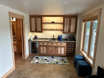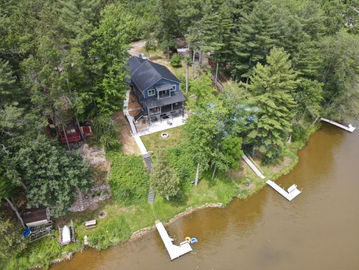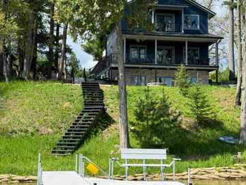 Our lake property features four bedrooms, three bath home with attached garage featuring an EV charger. Screen porch, fire pit and balcony showcase the stunning lake views while home itself creates a cozy yet modern vacation experience. This exceptional property features three living rooms, fire place and more. This stunning home features custom wood work, cabinets and custom furniture designed by https://cornerstonewoodworkingco.com/.